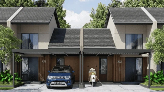Bagian depannya cantik dengan warna cat eksterior alami, lengkap dengan carport selebar 4,5 meter untuk dua mobil.